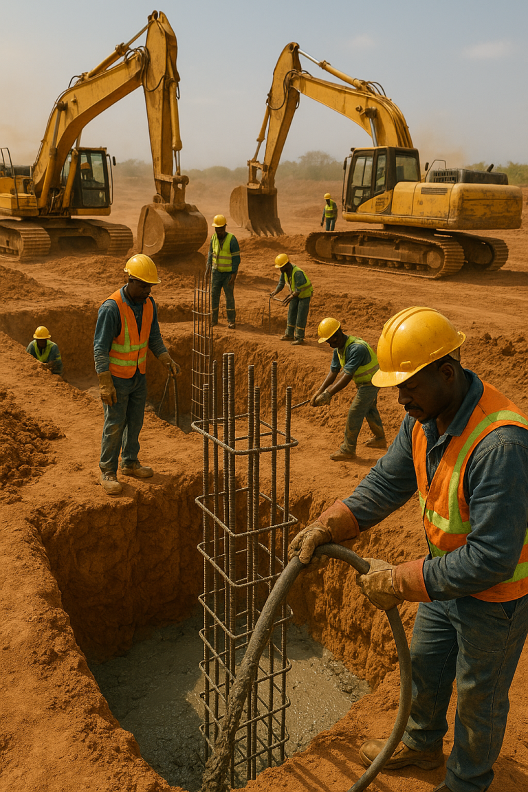 Infrastructures minières clés : Bases-vie, routes, terrassements, fondations.